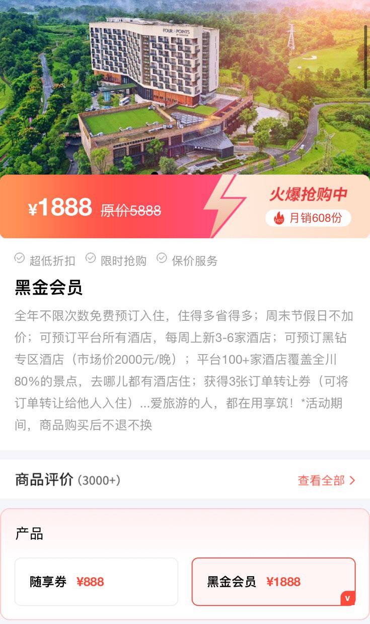 在购卡平台,黑金会员卡有着这样的描述:“全年住酒店不花钱,不限次数免费预订”“平台100+酒店,覆盖全川80%景点,去哪儿都有酒店住”。