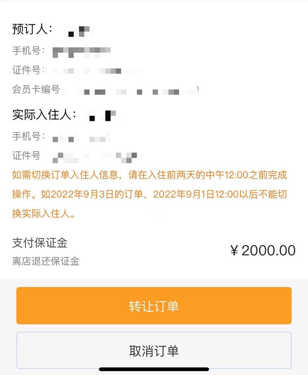 贺先生预订酒店并交了2000元押金。受访者供图