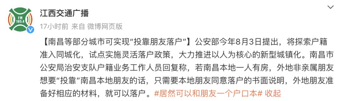 另据江西交通广播消息,南昌等部分城市可实现“投靠朋友落户”。南昌市公安局治安支队户籍业务工作人员表示,若南昌本地一人有房,外地非亲属朋友想要“投靠”南昌本地朋友的话,只需要本地朋友同意落户的书面说明,外地朋友准备好相应的材料,就可以落户。
