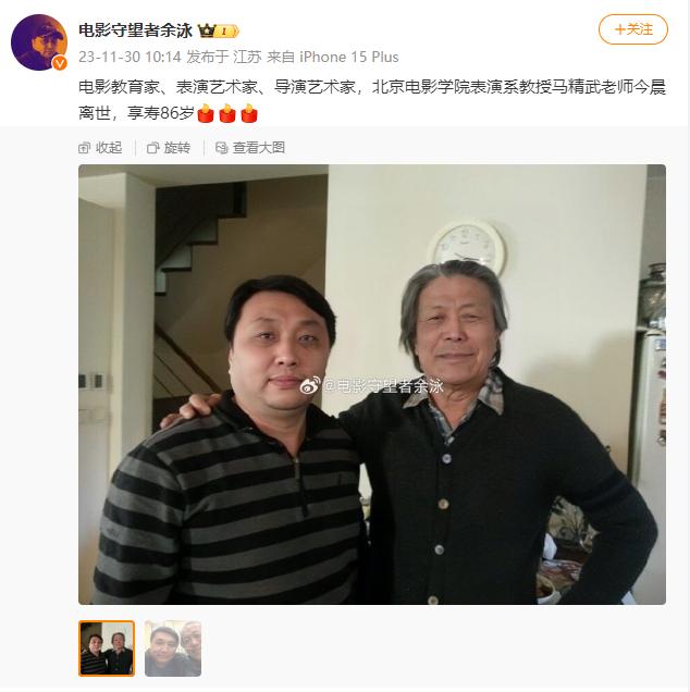 2023年11月30日,微博用户电影守望者余泳 发布博文称,电影教育家、表演艺术家、导演艺术家,北京电影学院表演系教授马精武老师今晨离世,享寿86岁。