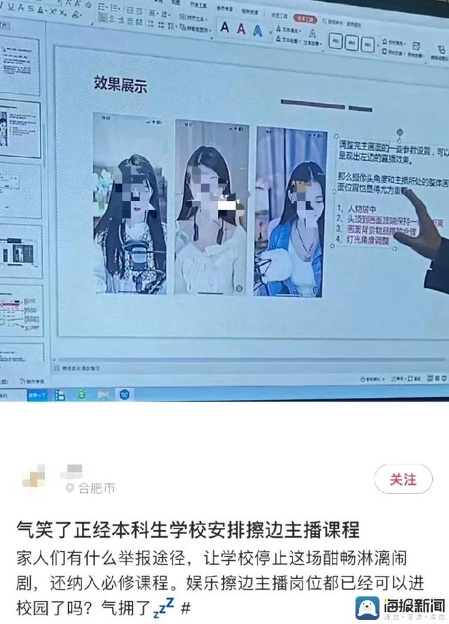 据网传截图显示,一网友在社交平台发布内容称:“气笑了正经本科生学校安排擦边主播课程”,并询问有何举报途径。另有一网友表示,学校让娱乐主播来给学生上课,教学生如何向所谓的“大哥”要钱,并让学生直播,不直播就属于不完成课程。该网友还表示,该课程目前已被纳入必修课。