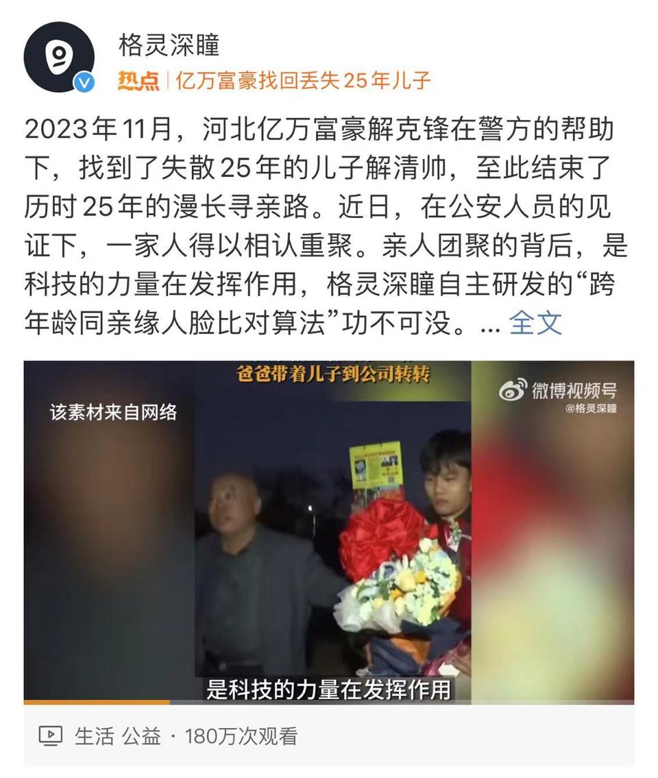 12月3日,格灵深瞳公司发文称,此次解克锋寻子成功背后的人脸比对算法正是出自该公司。“2023年11月,河北‘亿万富豪’解克锋在警方的帮助下,找到了失散25年的儿子解清帅,至此结束了历时25年的漫长寻亲路。近日,在公安人员的见证下,一家人得以相认重聚。亲人团聚的背后,是科技的力量在发挥作用,格灵深瞳自主研发的‘跨年龄同亲缘人脸比对算法’功不可没。”