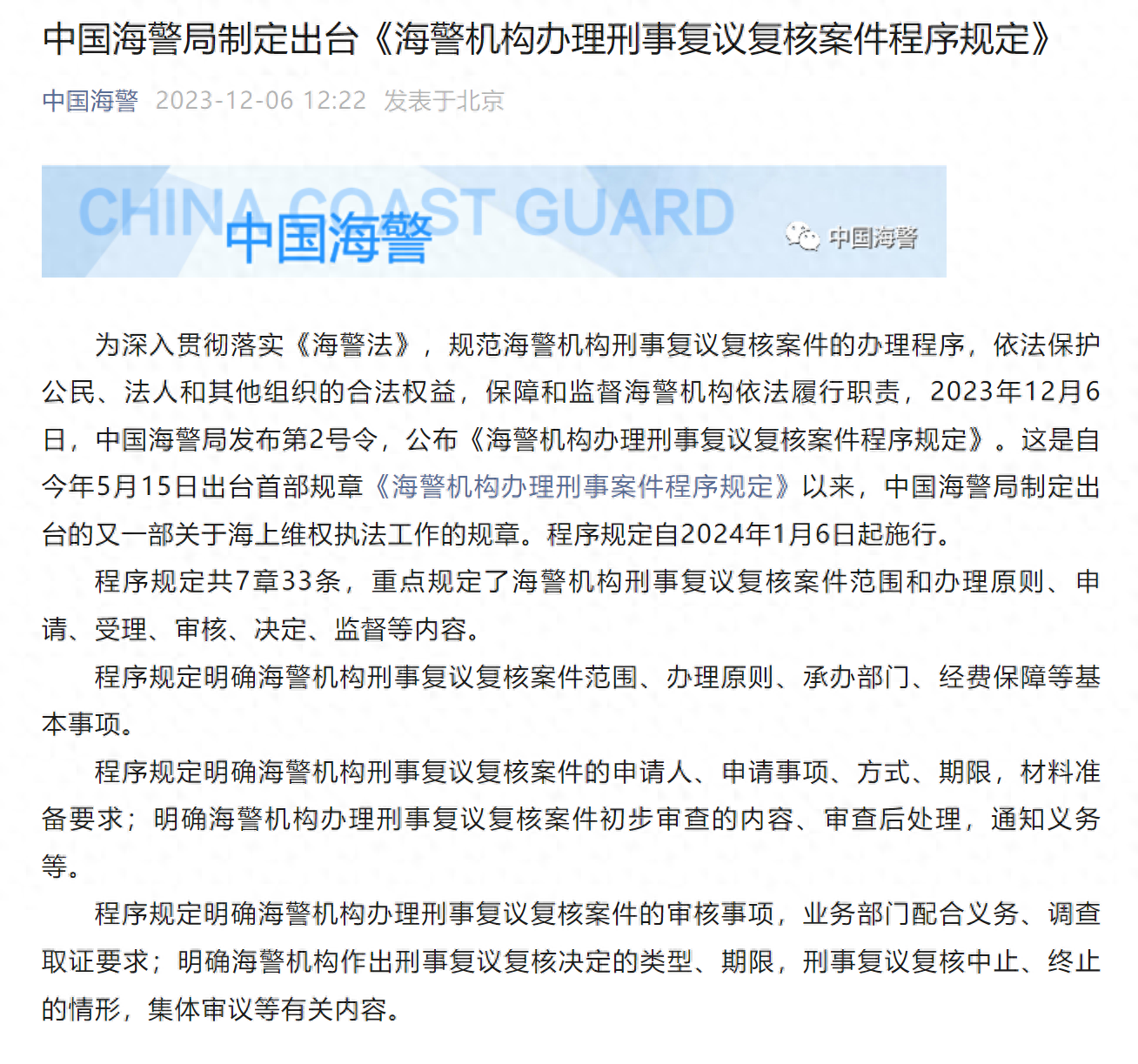 据中国海警:为深入贯彻落实《海警法》,规范海警机构刑事复议复核案件的办理程序,依法保护公民、法人和其他组织的合法权益,保障和监督海警机构依法履行职责,2023年12月6日,中国海警局发布第2号令,公布《海警机构办理刑事复议复核案件程序规定》。这是自今年5月15日出台首部规章《海警机构办理刑事案件程序规定》以来,中国海警局制定出台的又一部关于海上维权执法工作的规章。程序规定自2024年1月6日起施行。