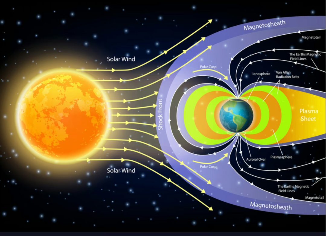 太阳高能粒子流(太阳风)对地球周边区域/地磁场相互作用的示意图