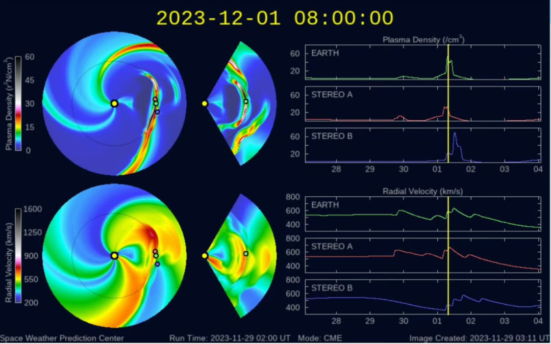 美国空间天气预测中心(SWPC)的CME模型图,上半部分为高能等离子体密度,下半部分为粒子流径向速度。左侧图中,黄道极坐标平面中心黄点为太阳,右侧绿点为地球,其余二者为探测卫星。图片来源:SWPC