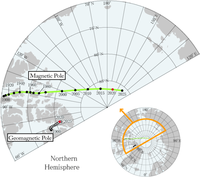 北极附近的总磁极(绿线)和偶极磁场磁极(红线)在1900年以来的移动(2025年的位置为预测结果)。图片来源:京都大学