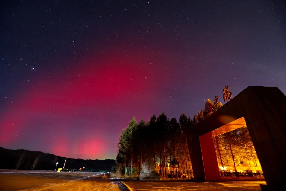 大部分地区所见的极光都呈现绚烂的红色,但在偏北的漠河等地还能看到绿色极光的明灭。图片来源:漠河市委宣传部