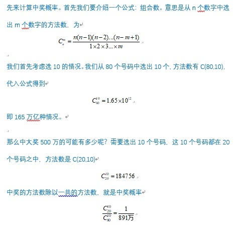 “但事实上,和该彩民一样的这种中奖概率是极小的。通过概率论计算得出,‘快乐8’的‘选7中7’平均中奖概率约为四万分之一,以此推断,如果每天买一注,大约需要连续购买四万多天,也就是大约112年,才能中得大奖;同理,下一注即中500万的平均中奖概率为1/891万,即每天都买一注,更是要一直买上24410年。”李永乐告诉记者,他根据中国福利彩票官网关于“快乐8”游戏规则,得以计算推断出此结论,具体计算过程如下: