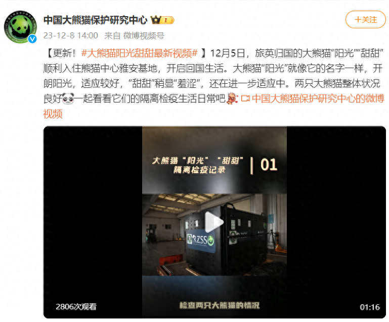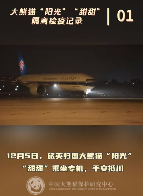 12月5日,旅英归国的大熊猫“阳光”“甜甜”顺利入住熊猫中心雅安基地,开启回国生活。大熊猫“阳光”就像它的名字一样,开朗阳光,适应较好,“甜甜”稍显“羞涩”,还在进一步适应中。两只大熊猫整体状况良好,一起看看它们的隔离检疫生活日常吧。