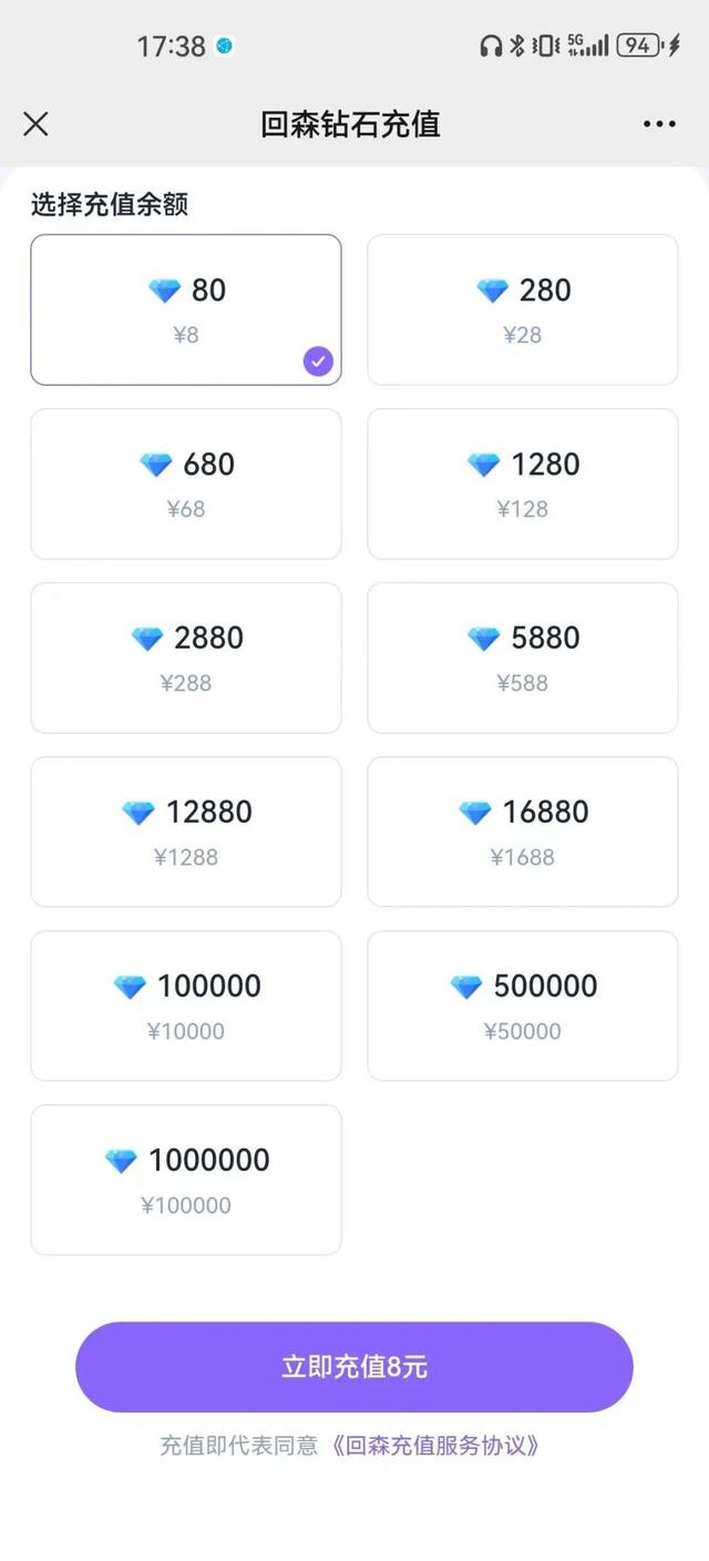 晨意帮忙记者下载了回森APP并进入一间歌房。记者发现,许多歌房写着“学生进”的字样。在歌房里,如果想要送礼,需要花费钻石来购买礼物。在直播间里,1枚钻石的价格是1毛, 1元钱起充。此外,通过微信搜索“回森充值”,搜索到名为回森APP的公众号,该公众号同样也能提供钻石充值服务,1688元可以购买16880颗钻石,最高可以单笔充值10万元。