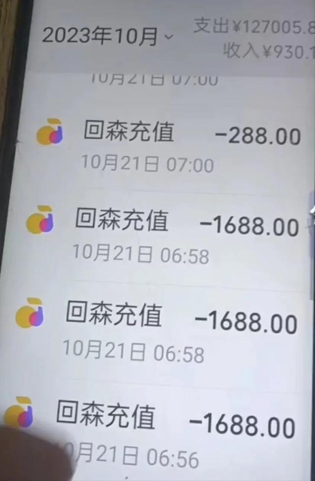 “我妈账户里有10几万的存款,将近一个月的时间就只剩84元了。”12月9日,毛女士向晨意帮忙记者求助称,她13岁的女儿小宁(化名)将老人家银行卡里的钱全部通过充值的方式,在一个月的时间里,在回森APP上充了10多万。