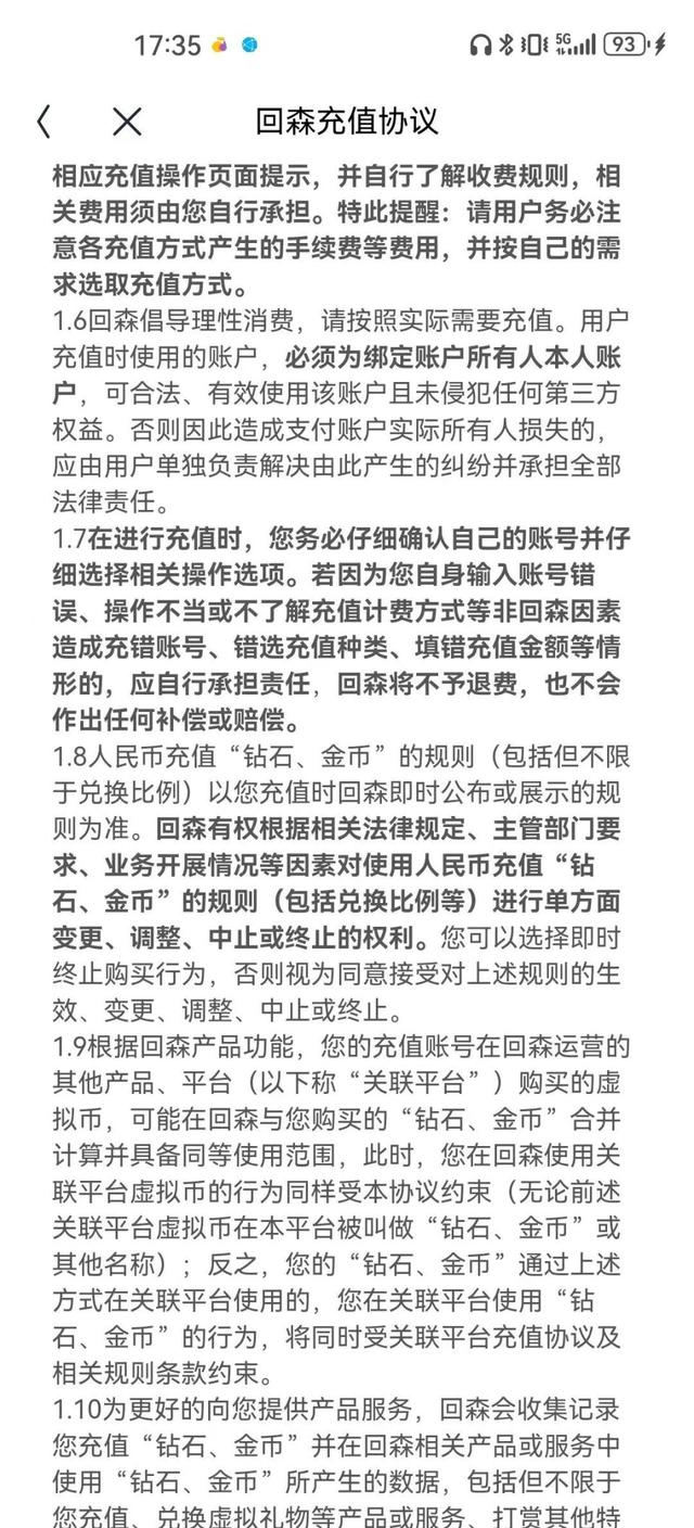 晨意帮忙记者点开协议,该协议发布于2022年4月1日,协议中用加粗字体写着:“回森不鼓励未成年人使用充值服务,未成年人请务必在监护人明示同意下操作或委托监护人操作,否则请勿使用本充值服务。”