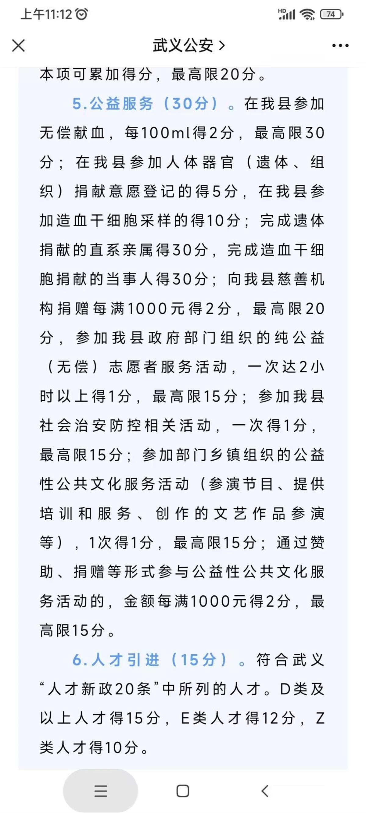 极目新闻记者注意到,2023年3月28日,武义县公安局官方微信公众号“武义公安”发布了稿件《速看!武义县2023年积分入学报名开始了》。该稿件显示,《武义县新市民量化积分管理实施办法(试行)》已于2023年3月1日起实行,根据《办法》规定,新市民子女义务教育阶段入学积分按照《武义县新市民量化积分管理赋分标准》来计算。该积分构成中包含了公益服务积分:参加无偿献血每100毫升得2分,最高限30分;完成遗体捐献的直系亲属得30分:向该县慈善机构捐赠每满1000元得2分,最高限20分……