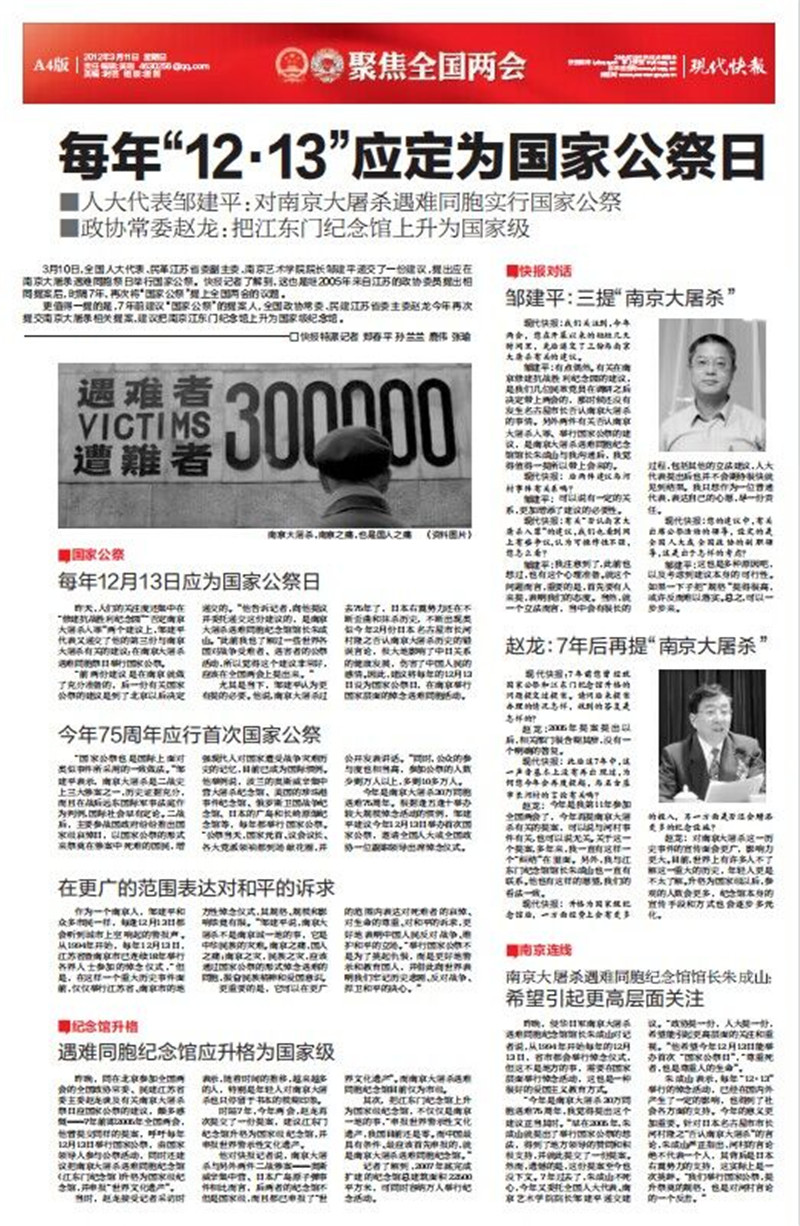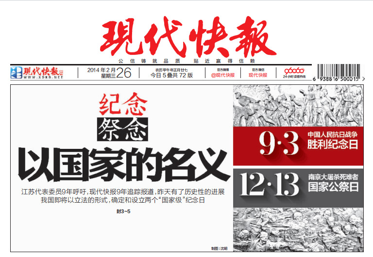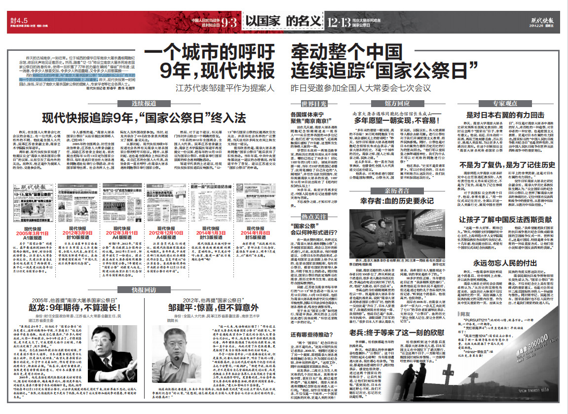 也正是从2005年起,现代快报开始持续追踪报道社会各界有关南京大屠杀国家公祭的呼吁和倡议。