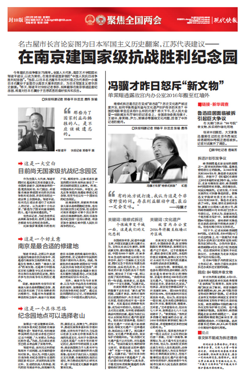 日本名古屋市长言论妄图为日本军国主义历史翻案,全国人大代表、南京艺术学院院长邹建平建议,在南京修建国家级的“中国人民抗日战争胜利纪念园”。