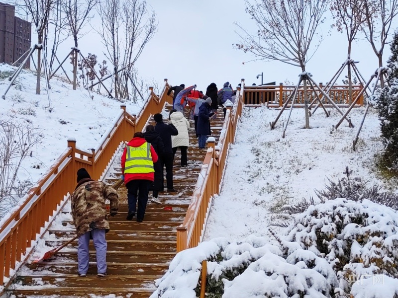 保定市园林基建服务中心干部职工清扫鲁岗公园上山步道积雪(央广网记者王艺霖摄)