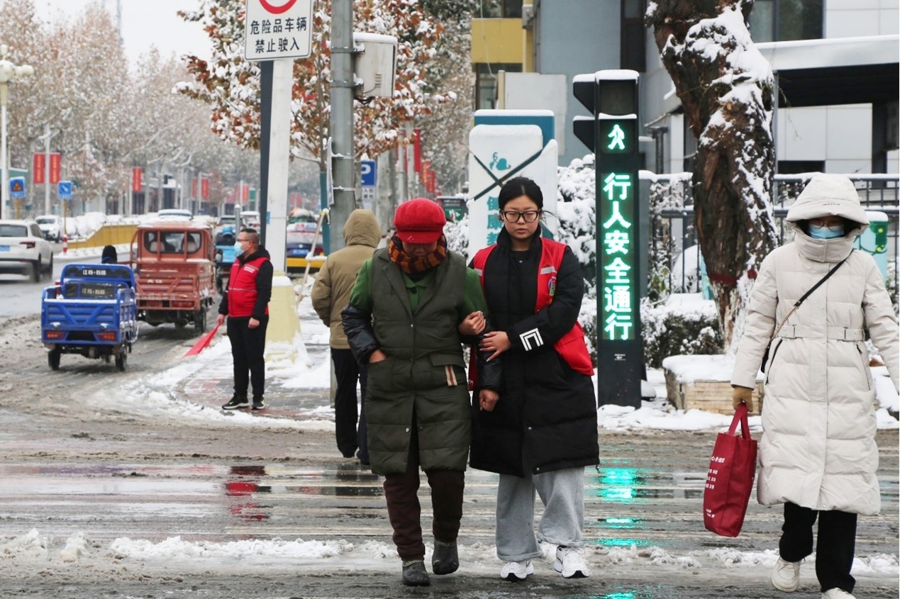 涞水县志愿者正在扶老人安全过马路(央广网发李金璐摄)