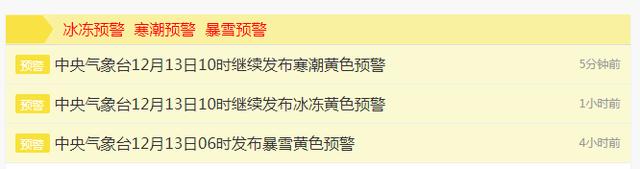 今天(13日),中央气象台发布暴雪黄色预警、冰冻黄色预警、寒潮黄色预警。