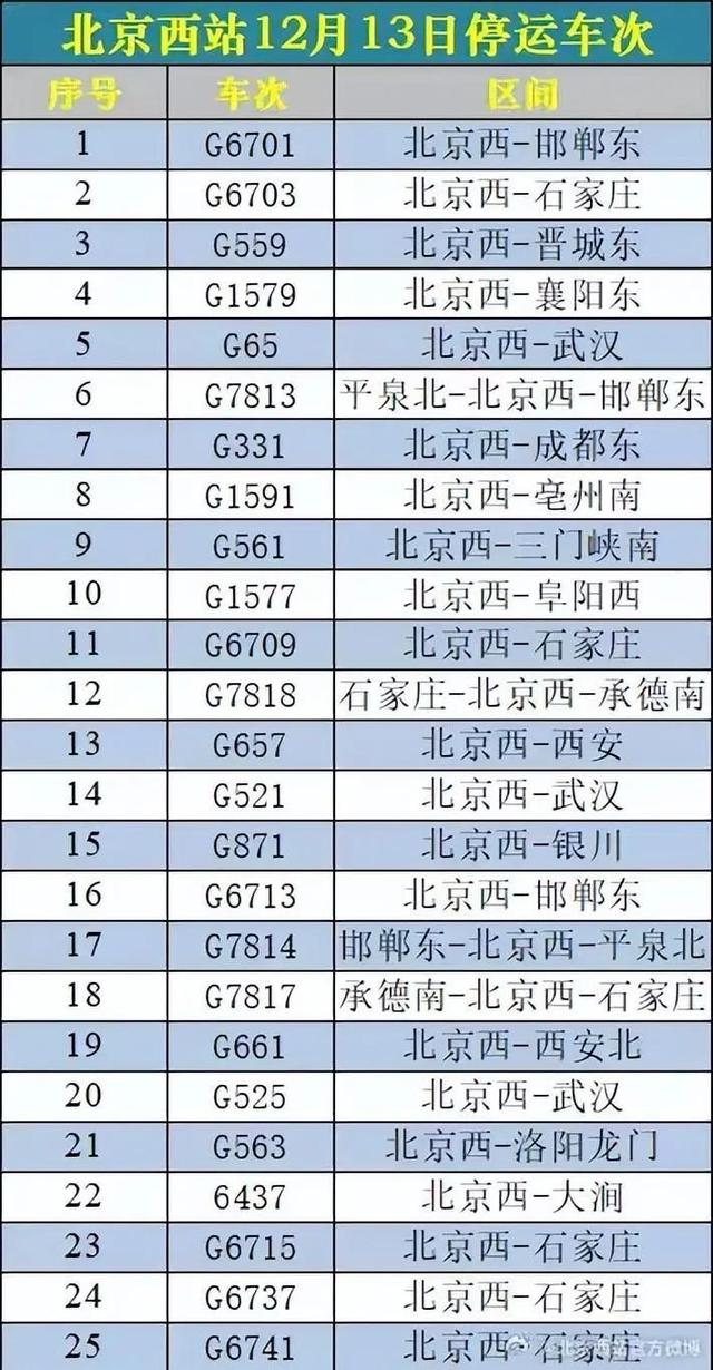 北京西站发布停运公告,受降雪影响,12月13日北京西站、北京丰台站部分列车临时停运,已购买停运列车车票的旅客,可于30日内办理全额退票手续。请广大旅客合理安排出行,关注车站公告或12306网站信息。