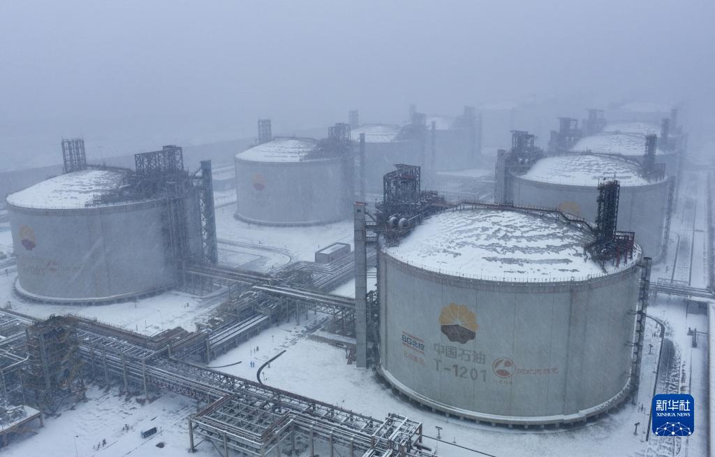 12月14日拍摄的雪中的河北省唐山市曹妃甸区中石油唐山LNG接收站(无人机照片)。