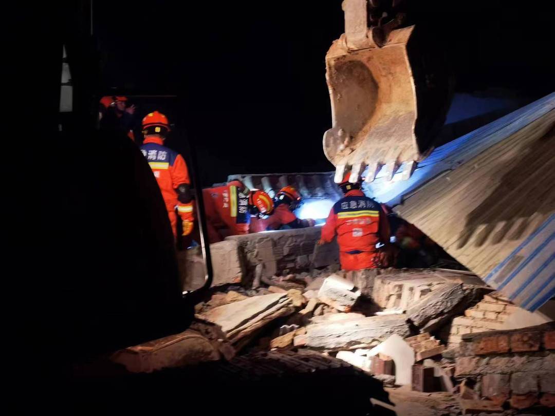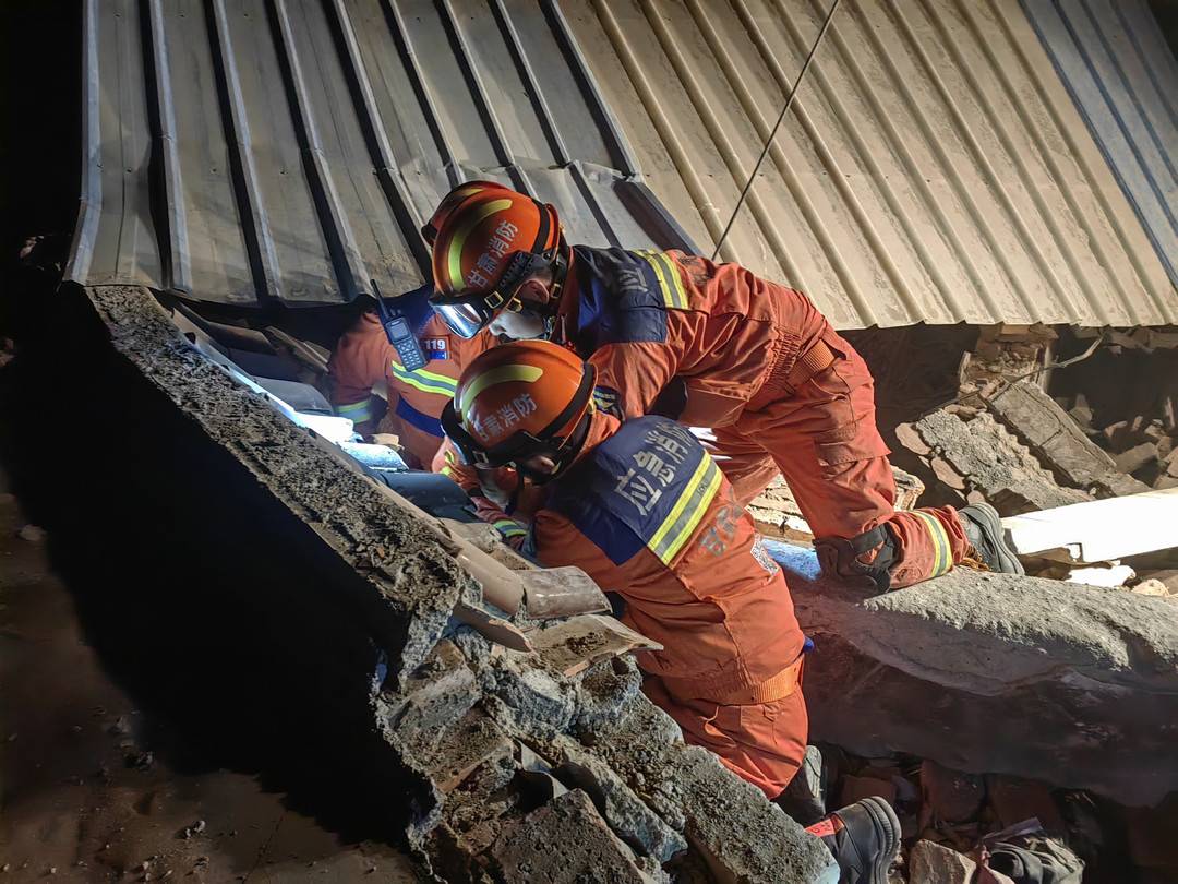 临夏消防指战员在陈家村进行紧张搜救。(图片来源:甘肃消防救援总队)