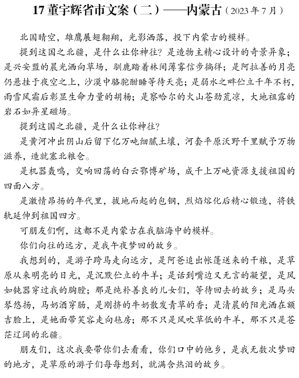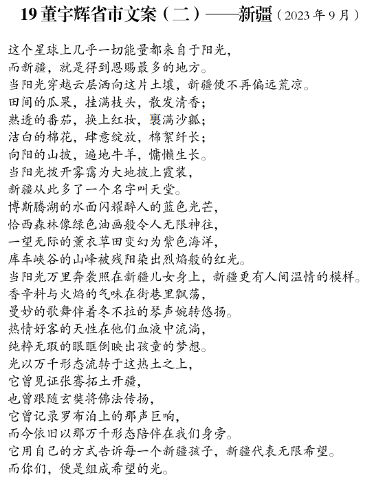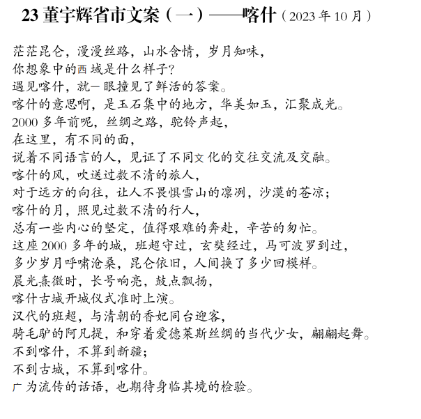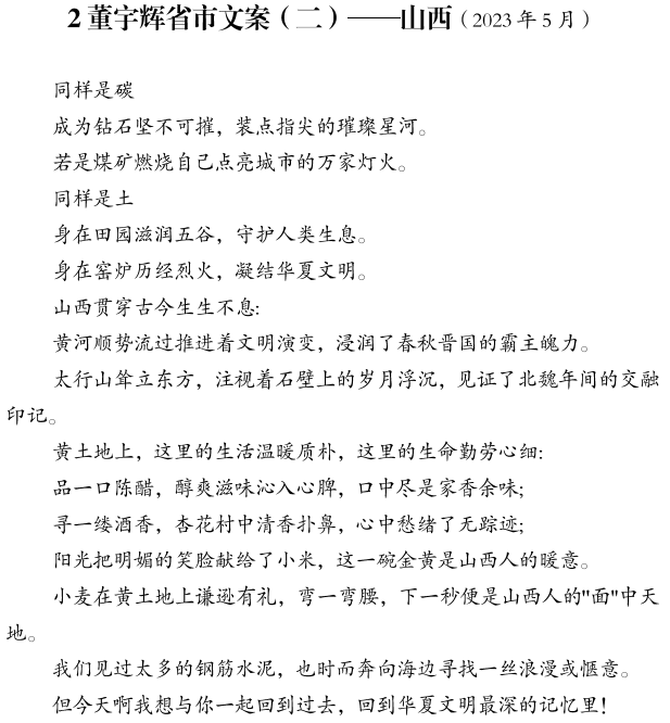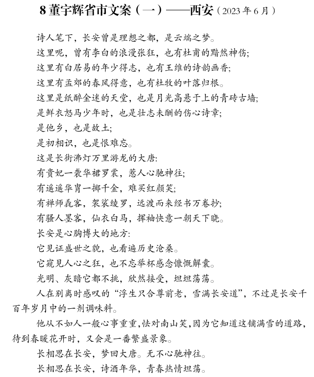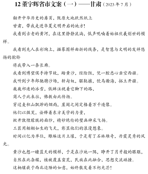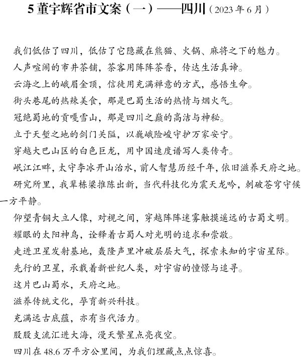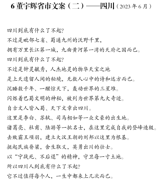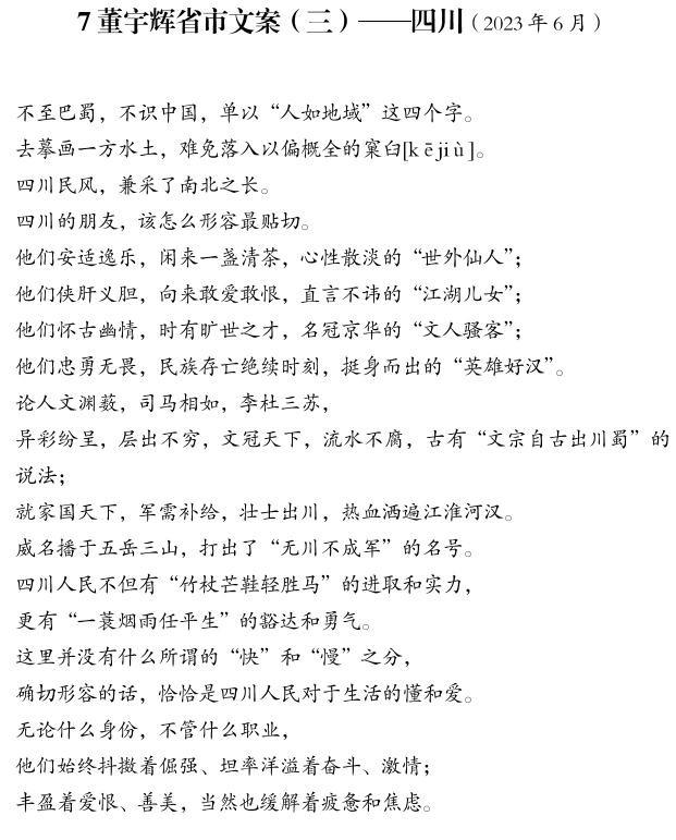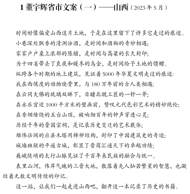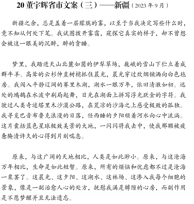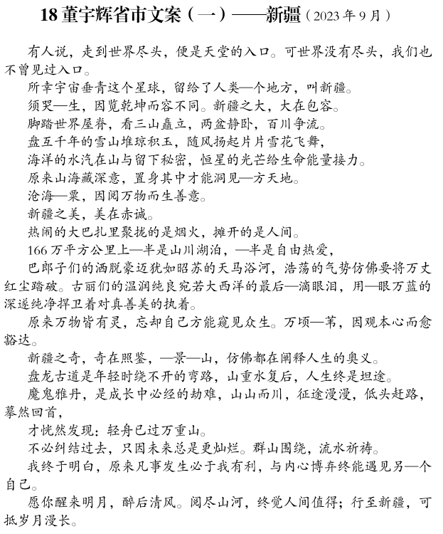 在“小作文风波”以外,我们能看到,董宇辉给各省份写下的小作文,富有美感,寥寥几语说透每个省份的前世今生和独特所在,堪称文旅宣传的满分文案。