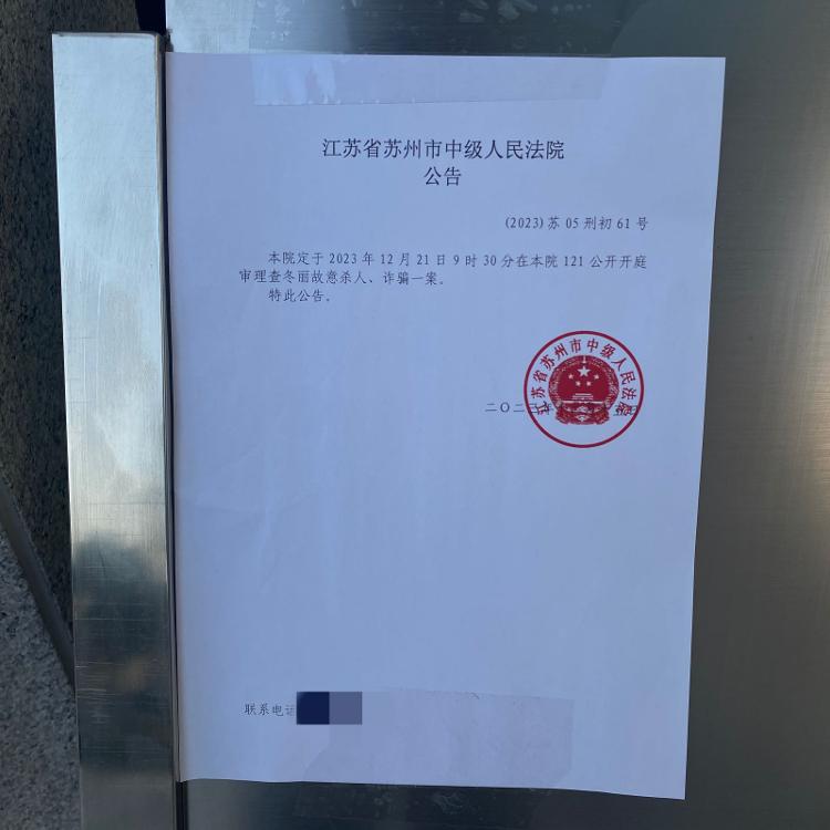 苏州中院门口张贴的“查冬丽故意杀人、诈骗案”开庭公告