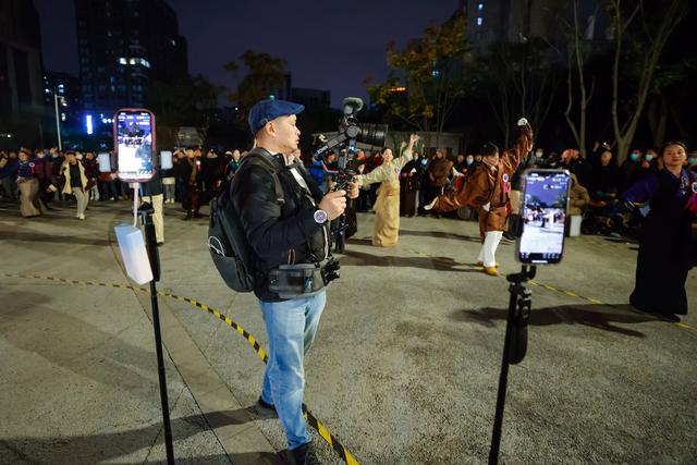 一名摄影师在成都锦外中心附近的广场拍摄“卓热查姆锅庄团队”的锅庄舞会(12月16日摄)。新华社记者 沈伯韩 摄