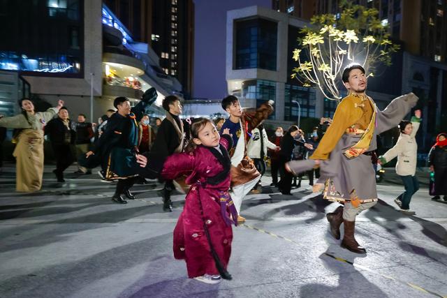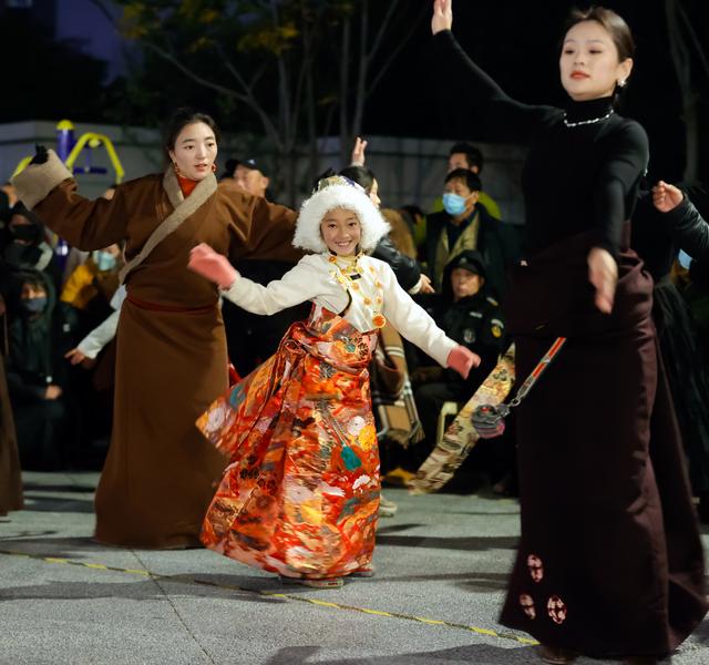 在成都锦外中心附近的广场上,来自四川甘孜藏族自治州德格县的10岁女孩曲张措和大人们一起跳锅庄(12月23日摄)。新华社记者 沈伯韩 摄