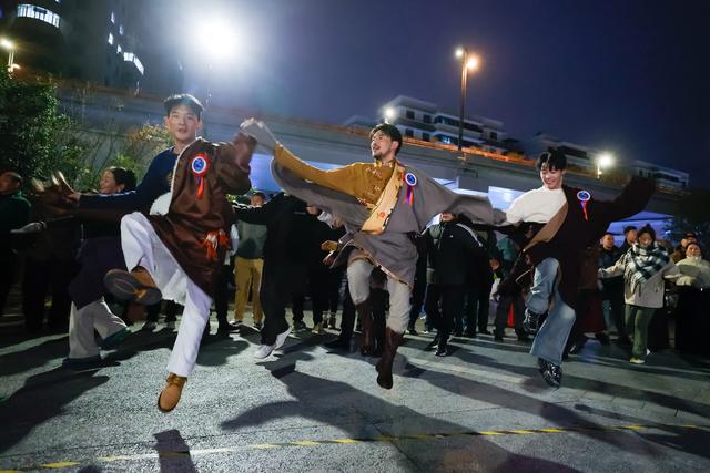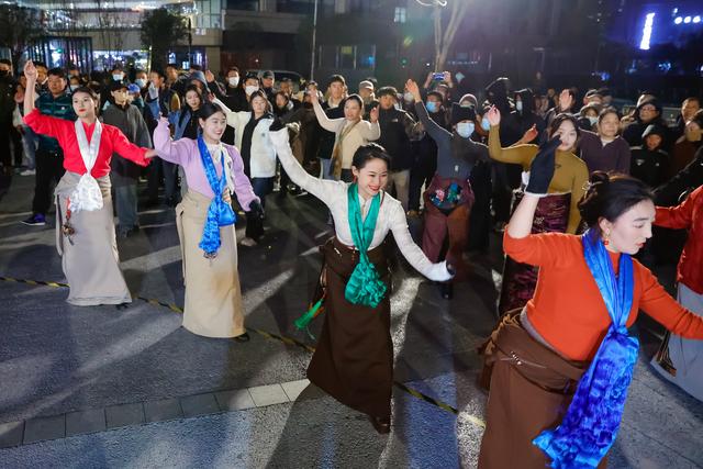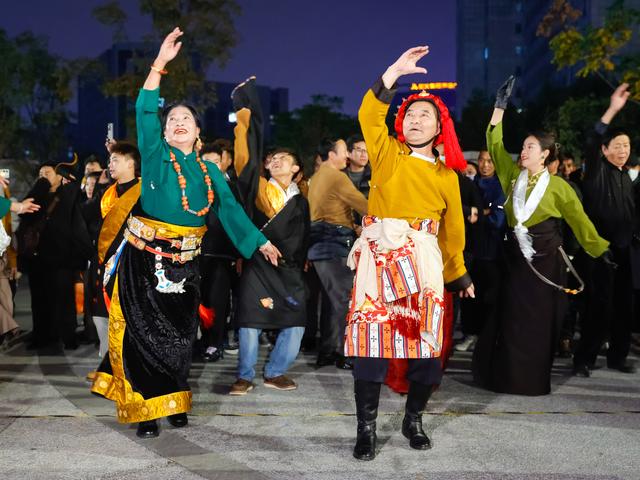 来自青海玉树藏族自治州的锅庄团队(前)来到成都锦外中心附近的广场,与这里的锅庄舞者们交流舞艺(12月23日摄)。新华社记者 沈伯韩 摄