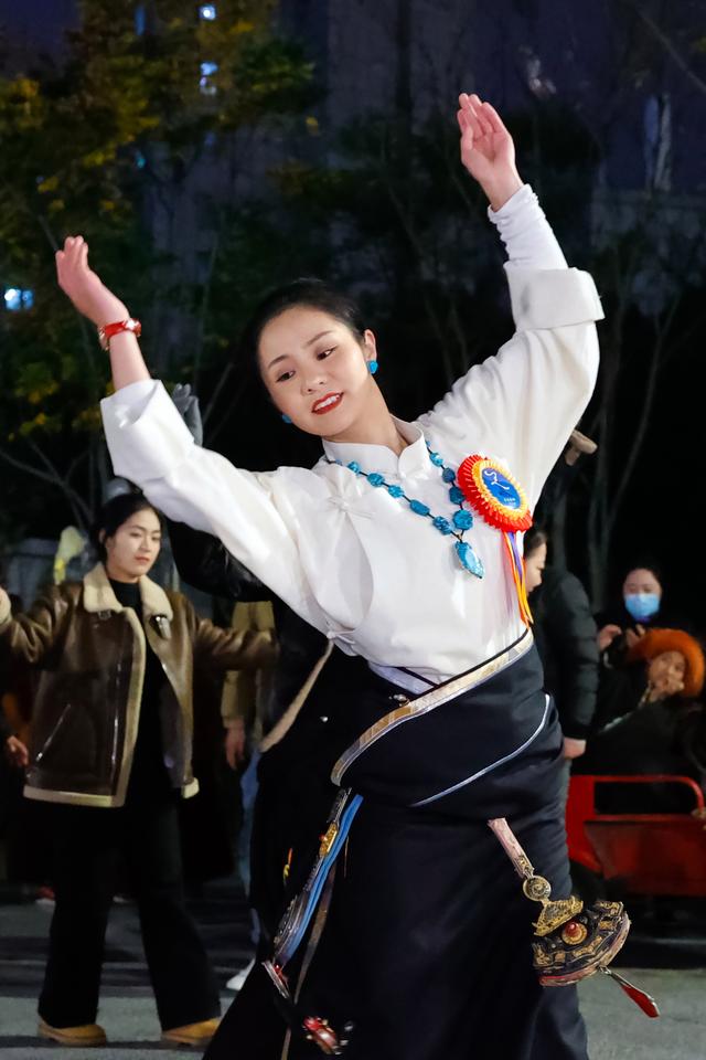 雍吉在成都锦外中心附近的广场上领跳锅庄(12月16日摄)。新华社记者 沈伯韩 摄
