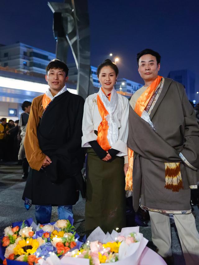 “卓热查姆锅庄团队”创始人——扎西泽仁、雍吉、洛桑日者(从左至右)在成都锦外中心附近的广场上合影(12月23日摄)。新华社记者 沈伯韩 摄