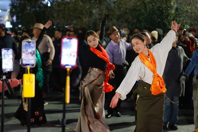 雍吉(前右)在成都锦外中心附近的广场上领跳锅庄,附近立着几部手机直播锅庄舞会(12月23日摄)。新华社记者 沈伯韩 摄