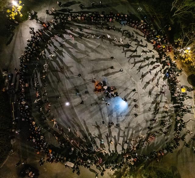 人们在成都锦外中心附近的广场上跳锅庄(无人机照片,12月16日摄)。新华社记者 沈伯韩 摄