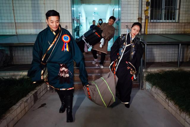 雍吉(右)和洛桑日者(左)、扎西泽仁(中)将音箱、电源线等设备搬往成都锦外中心附近的广场,为即将开始的锅庄舞会做准备(12月16日摄)。新华社记者 沈伯韩 摄