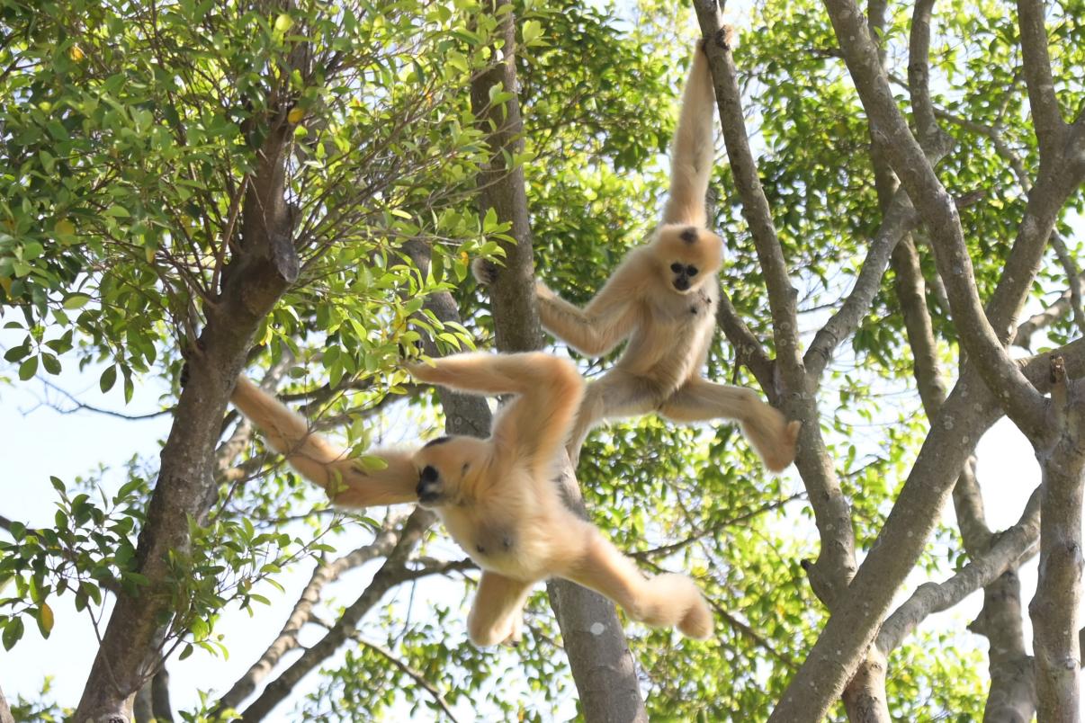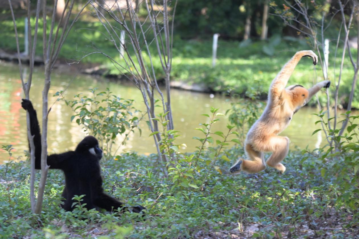 上午10时,只见饲养员打开长臂猿岛里“小别墅”的门,长臂猿个个身手敏捷,瞬间爬到树上,轻握树枝将身体抛出,腾空游荡,穿梭于树林间,动作优美,仿佛玩起了“体操高低杠”,其乐融融。