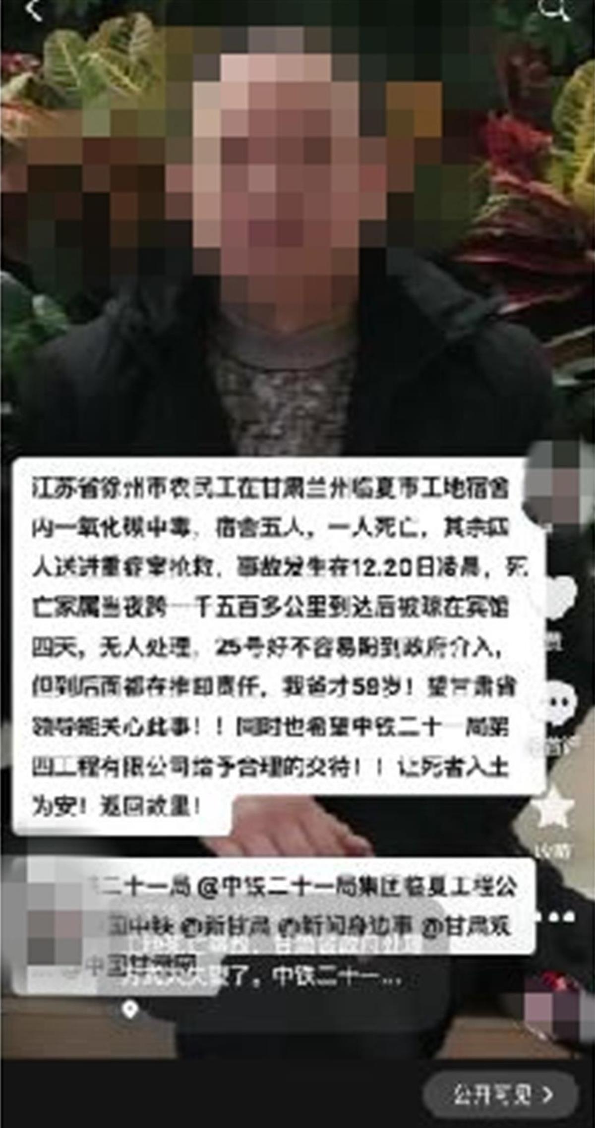 网友在视频中称,有来自江苏徐州的农民工在临夏市的工地宿舍内发生一氧化碳中毒。“宿舍5人,1人死亡,其余4人送进重症室抢救。”该网友表示,此事发生在12月20日凌晨,死者是其父亲。