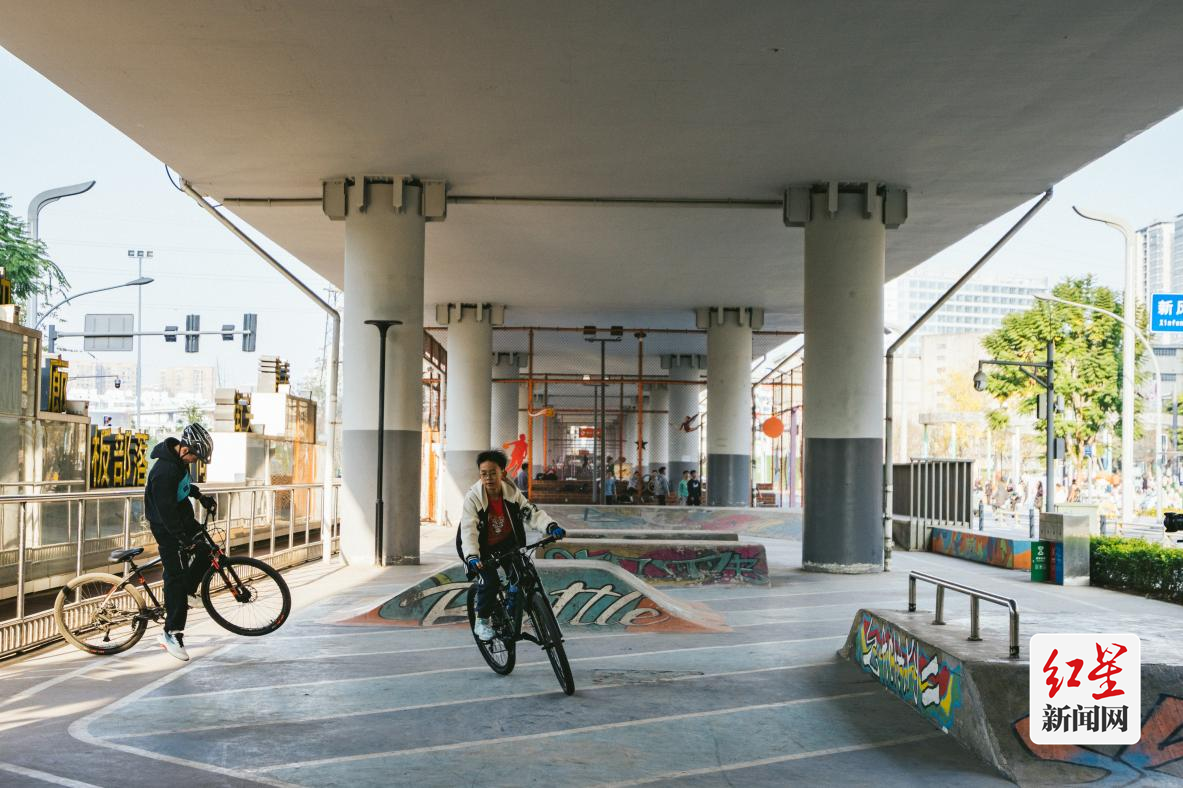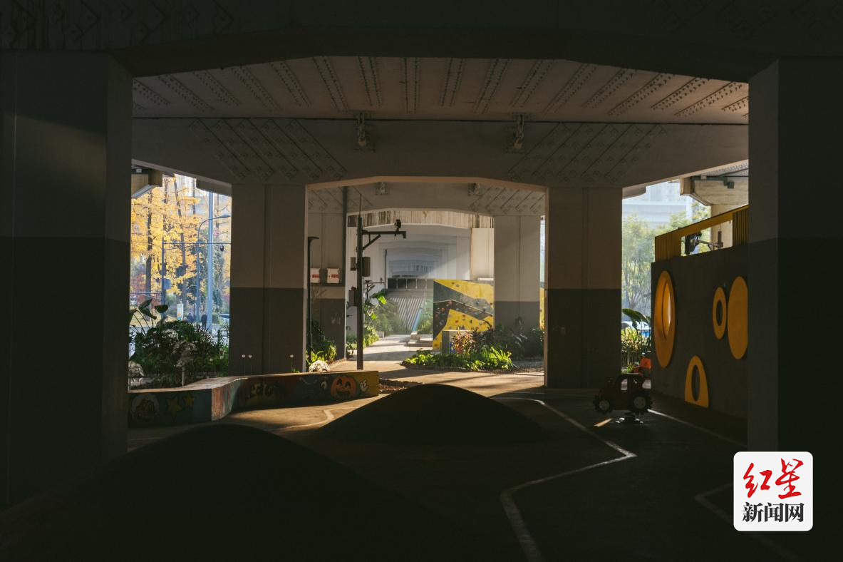 在成都市成华区府青路三段立交桥下的成华府青运动空间,这里充分利用立交桥下空间,设置了植物景观、运动设施、涂鸦墙、儿童乐园等等……各个区域都有小朋友在玩耍。运动空间外侧设置了安全栏杆、标志标牌,充分保障区域的安全。