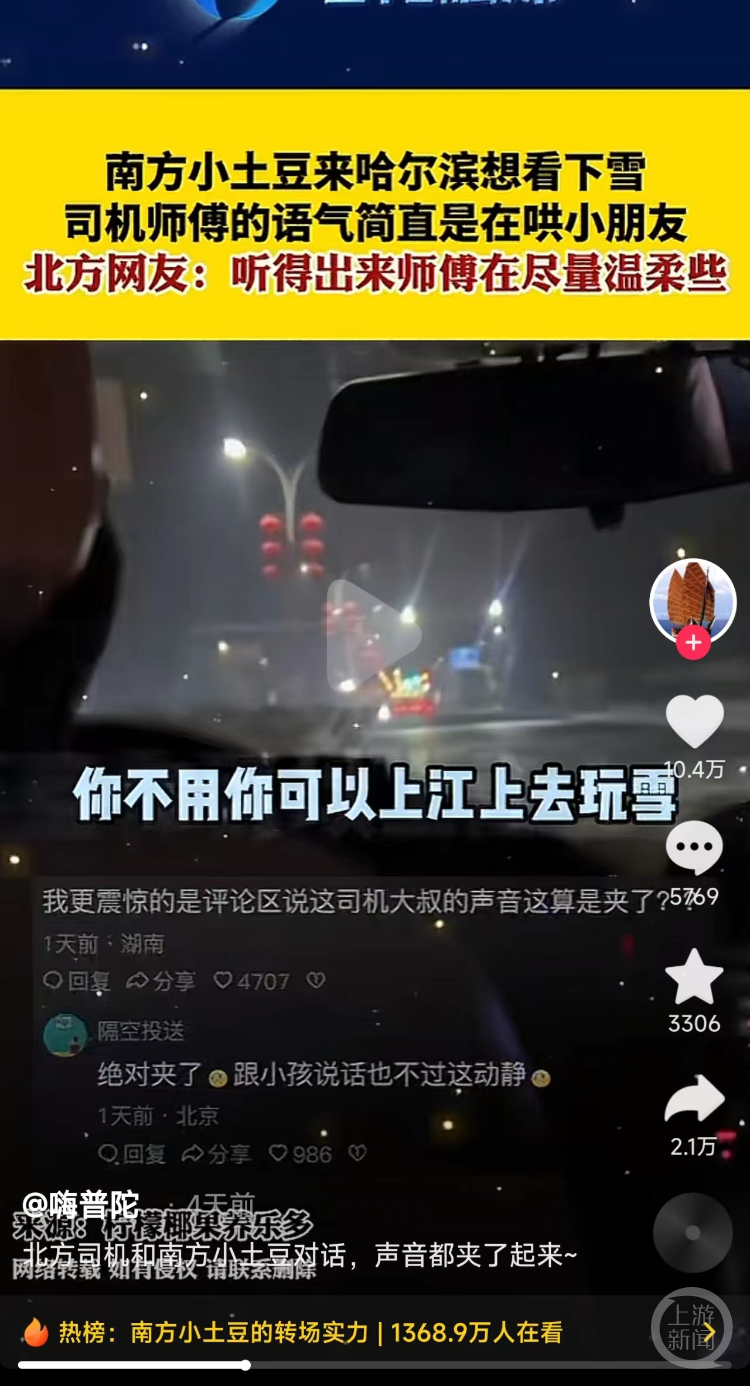 近日一段视频在网上爆火。一个哈尔滨出租车司机载了一个南方小姑娘,乘客问“什么时候下雪”,因为当时没有下雪,出租车司机大哥用了最温柔甚至有点“夹子音”的语气努力推荐哪里去玩雪,还安慰对方。