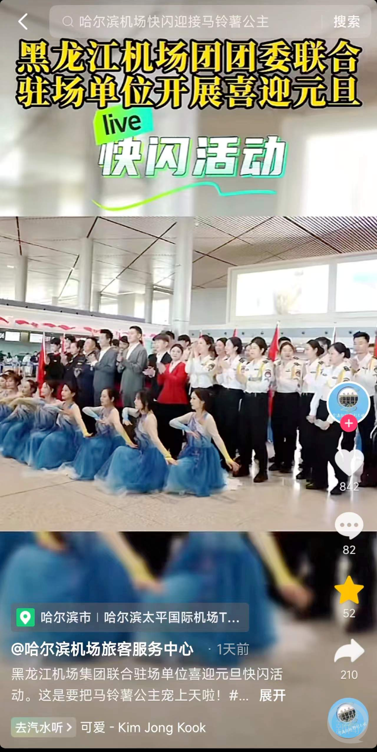 12月29日,黑龙江机场集团团委联合驻场单位,开展喜迎2024元旦歌舞快闪活动,欢迎远道而来的“马铃薯公主”们,节目直接号称“哈尔滨机场要把马铃薯公主宠上天”。