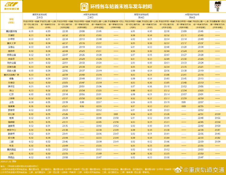 重庆轨道交通最新运营时刻表来了:更新10号线、环线