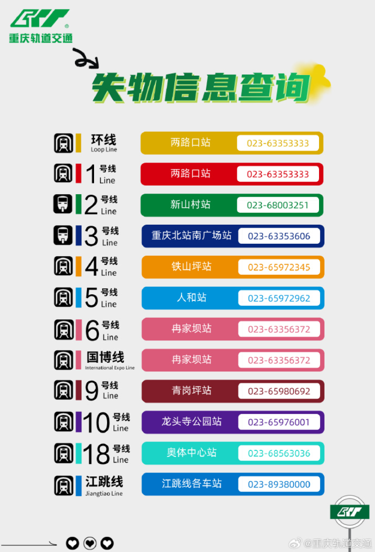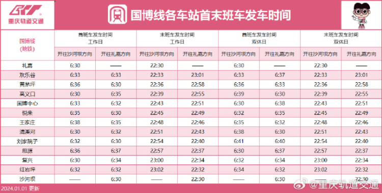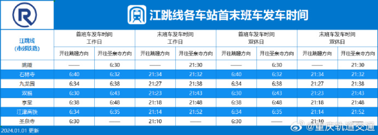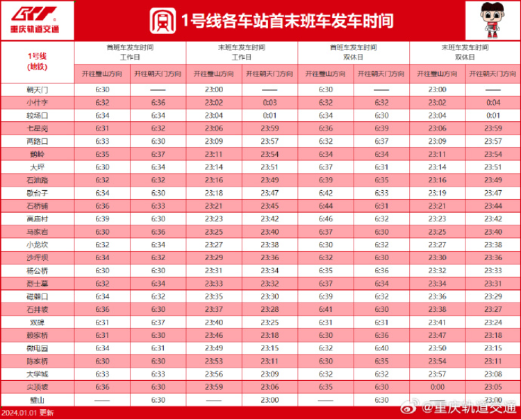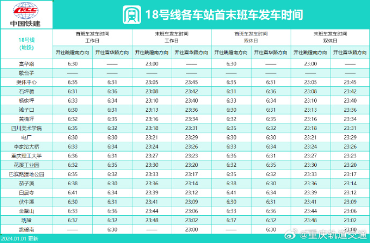 1月2日,重庆轨道交通发布最新运营时刻表,最新重庆轨道交通线网图、失物招领电话、各线路首末班车发车时间(更新10号线、环线)。
