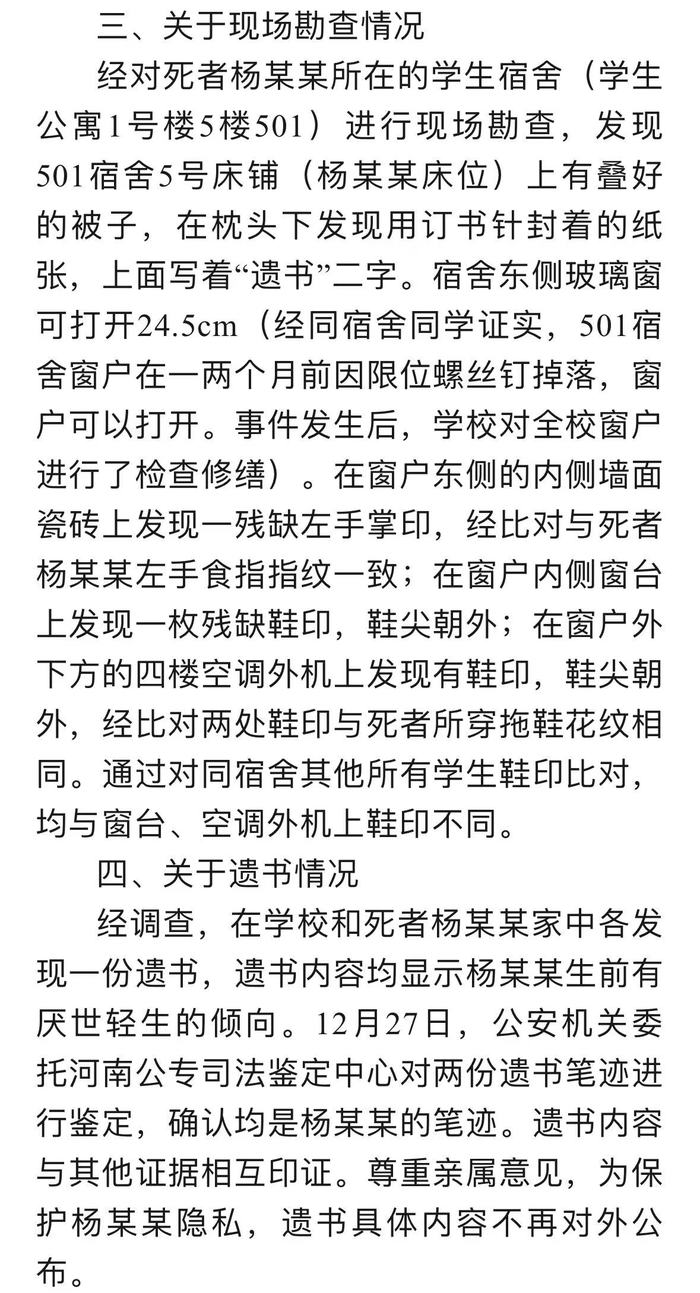 经调查,在学校和死者杨某某家中各发现一份遗书,遗书内容均显示杨某某生前有厌世轻生的倾向。12月27日,公安机关委托河南公专司法鉴定中心对两份遗书笔迹进行鉴定,确认均是杨某某的笔迹。遗书内容与其他证据相互印证。尊重亲属意见,为保护杨某某隐私,遗书具体内容不再对外公布。