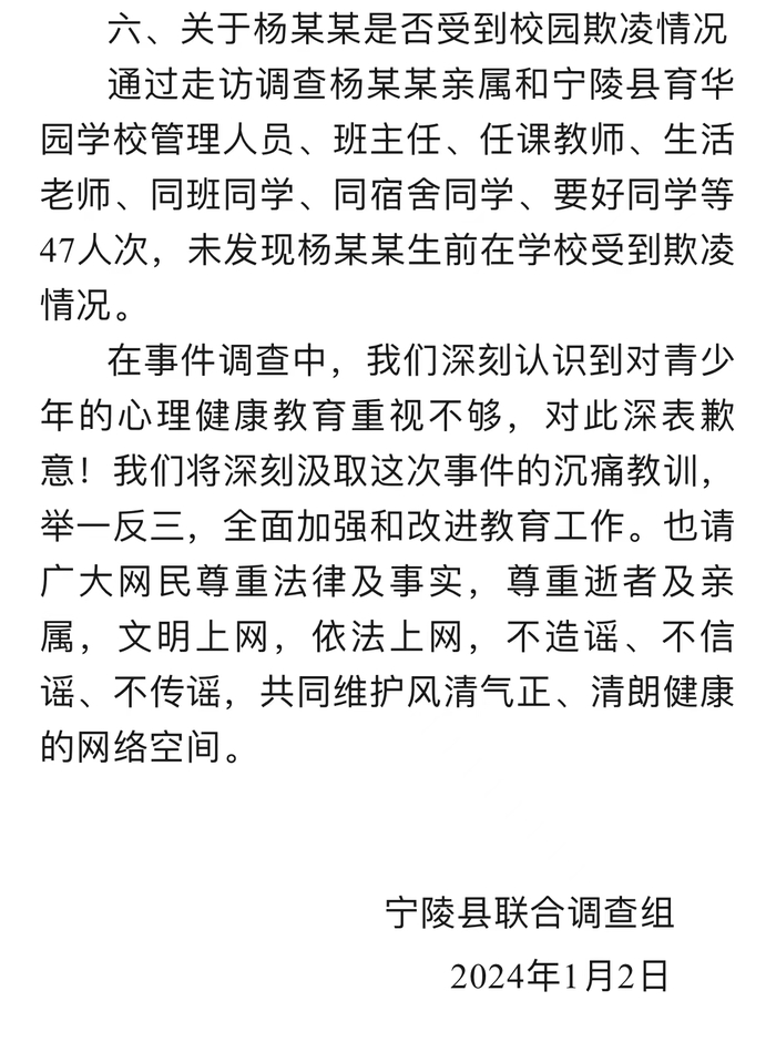 在事件调查中,我们深刻认识到对青少年的心理健康教育重视不够,对此深表歉意!我们将深刻汲取这次事件的沉痛教训,举一反三,全面加强和改进教育工作。也请广大网民尊重法律及事实,尊重逝者及亲属,文明上网,依法上网,不造谣、不信谣、不传谣,共同维护风清气正、清朗健康的网络空间。