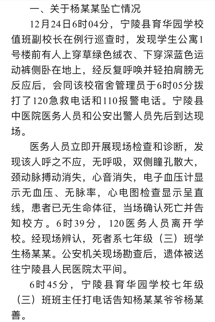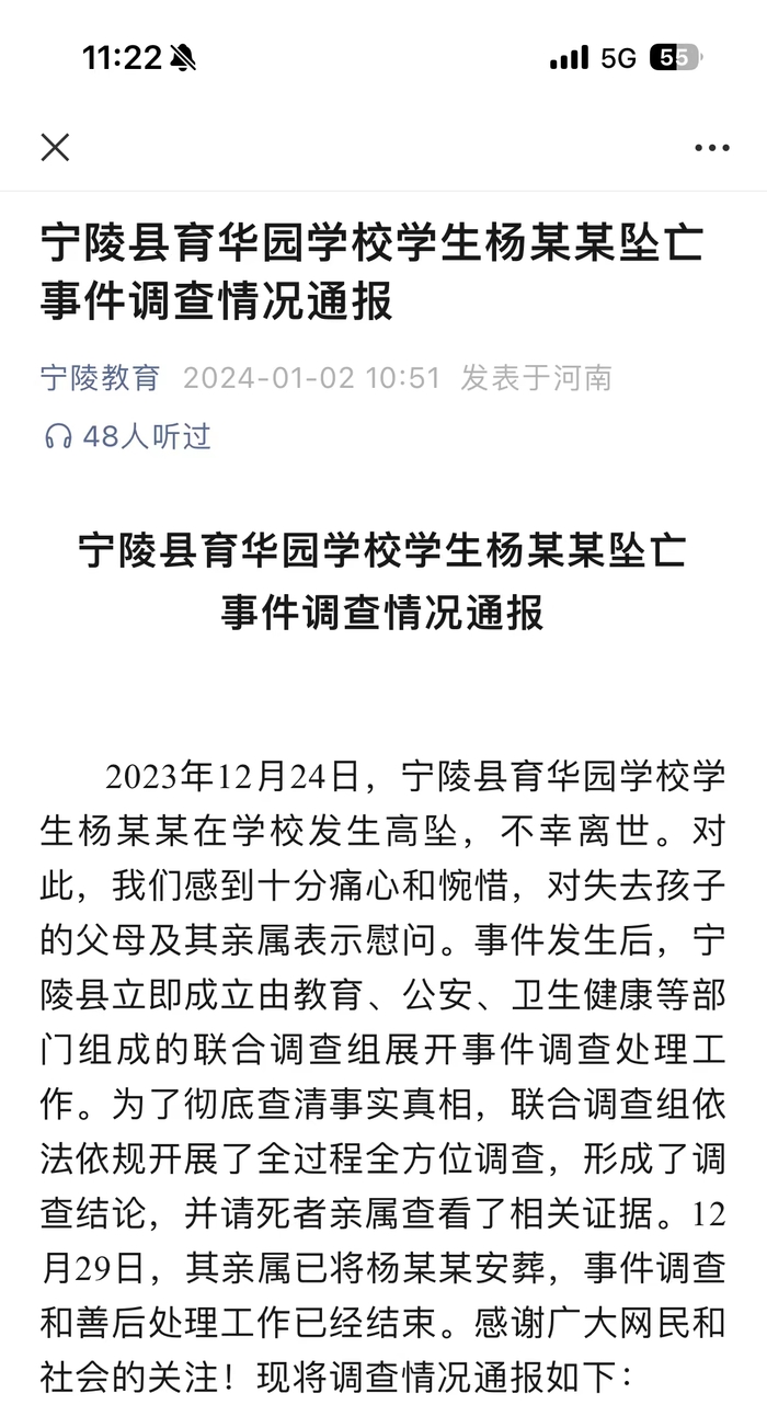 宁陵县育华园学校学生杨某某坠亡事件调查情况通报