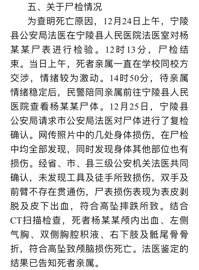 为查明死亡原因,12月24日上午,宁陵县公安局法医在宁陵县人民医院法医室对杨某某尸表进行检验。12时13分,尸检结束。当日上午,死者亲属一直在学校同校方交涉,情绪较为激动。14时50分,待亲属情绪稳定后,民警陪同亲属前往宁陵县人民医院查看杨某某尸体。12月25日,宁陵县公安局请求市公安局法医对尸体进行了复检确认。网传照片中的几处身体损伤,在尸检中均全部发现,同时发现身体其他部位也有损伤。经省、市、县三级公安机关法医共同确认,未发现工具及徒手所致损伤,双手及前臂不存在贯通伤,尸表损伤表现为表皮剥脱及皮下出血,符合高坠摔跌所致。结合CT扫描检查,死者杨某某颅内出血、左侧气胸、双侧胸腔积液、右下肢及骶尾骨骨折,符合高坠致颅脑损伤死亡。法医鉴定的结果已告知死者亲属。