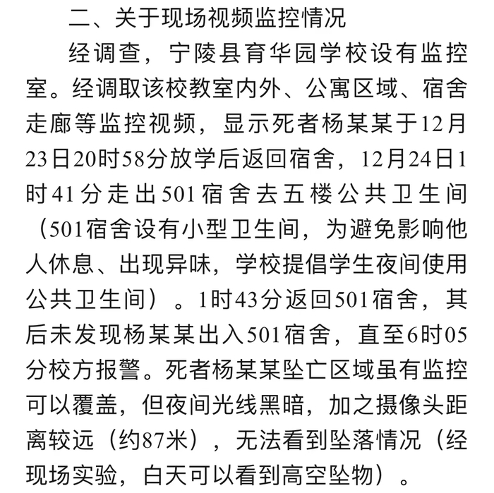 经调查,宁陵县育华园学校设有监控室。经调取该校教室内外、公寓区域、宿舍走廊等监控视频,显示死者杨某某于12月23日20时58分放学后返回宿舍,12月24日1时41分走出501宿舍去五楼公共卫生间(501宿舍设有小型卫生间,为避免影响他人休息、出现异味,学校提倡学生夜间使用公共卫生间)。1时43分返回501宿舍,其后未发现杨某某出入501宿舍,直至6时05分校方报警。死者杨某某坠亡区域虽有监控可以覆盖,但夜间光线黑暗,加之摄像头距离较远(约87米),无法看到坠落情况(经现场实验,白天可以看到高空坠物)。