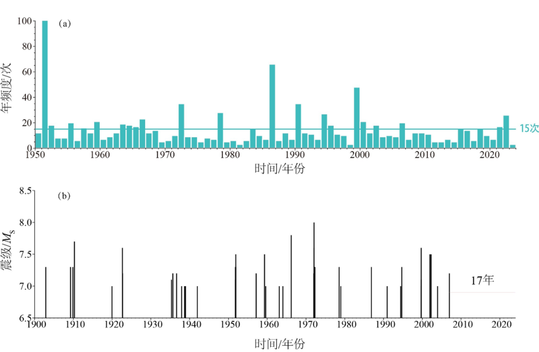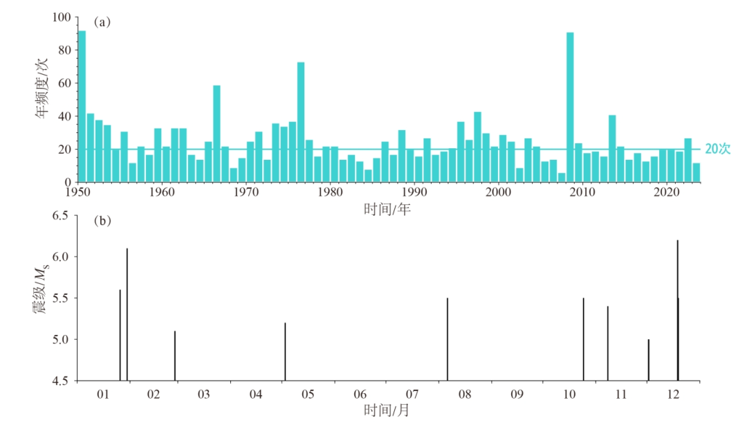 2023年以来大陆地区发生5级以上地震11次,最大为12月18日甘肃积石山6.2级地震,活动水平较2022年(27次,最大为2022年1月8日青海门源6.9级地震)和历史平均水平(20次)明显偏弱(图a)。2023年5级以上地震时间分布不均匀,1月至2月发生3次,3月至9月仅发生2次,10月至12月增至6次,出现5级以上地震由弱转强的活动特征(图b)。