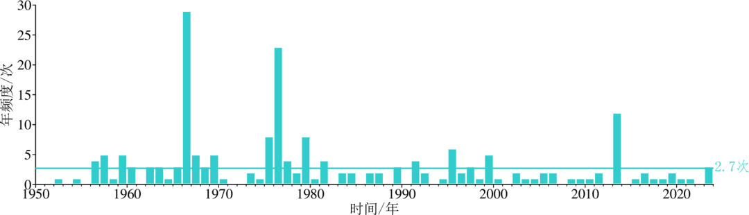 2023年以来大陆东部及附近海域发生5级以上地震3次,分别为6月24日北部湾5.0级、8月6日山东平原5.5级和10月23日广东南澳县海域5.0级地震,地震活动水平较2022年(0次)显著增强,为2014年以来活动频次最高年份。
