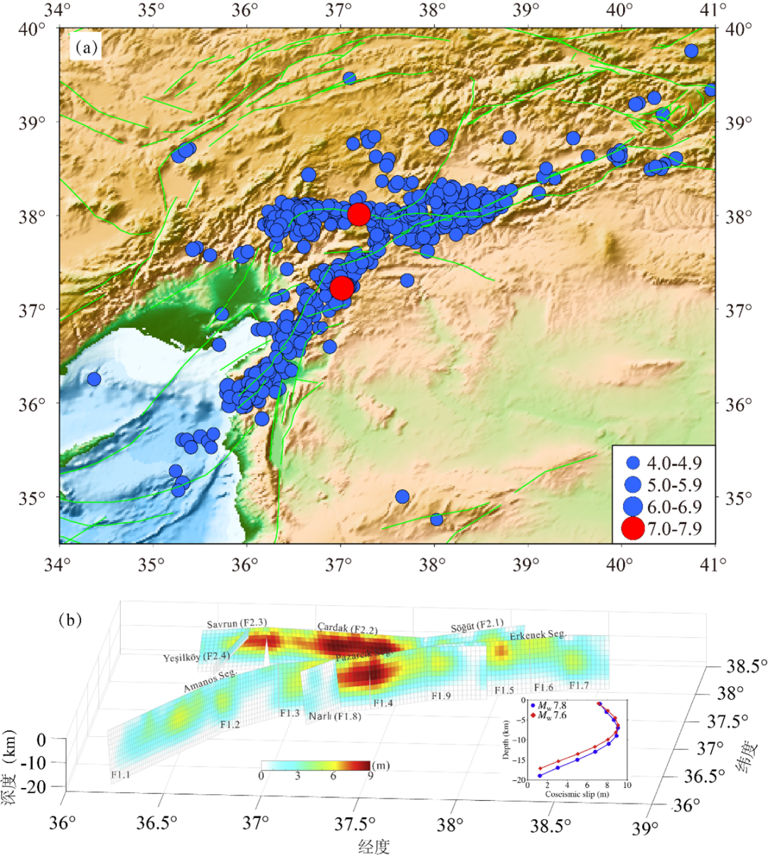 土耳其两次7.8级地震及其余震分布(a)和两次主震的滑动位移分布(b)